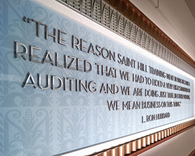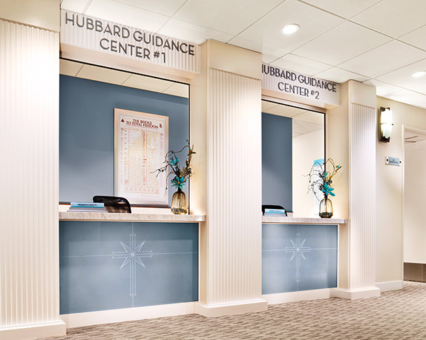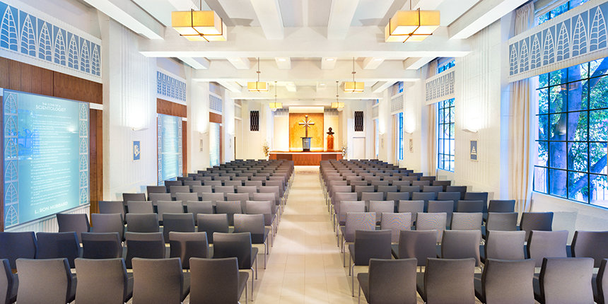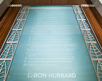 Scientologer, der går op ad Broen på L. Ron Hubbard Way, fortsætter uddannelse og auditering på højere niveauer i den ideelle Amerikanske Saint Hill Organisation (ASHO).
