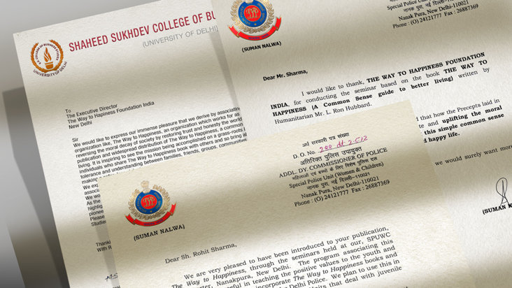 Rohit Sharma uddeler tusindvis af Vejen til lykke-hæfter i skoler i Indien, hvor de skaber håb og forståelse og forandring i et udfordrende miljø. På det tidspunkt erkendte den stedfortrædende kommissær for den særlige enhed for beskyttelse af kvinder og børn fra Delhis politi værdien af programmet og bestilte specialdesignede omslag for at sikre, at modtagerne vidste, at dette var deres hæfte, når 10.000 eksemplarer blev uddelt af politibetjente. Efter et tilsvarende fald i kriminaliteten fulgte et krav fra hovedkontoret om at uddanne 500 politibetjente i ethvert aspekt af dette program. Det resulterede i et fuldt partnerskab med Delhis politi, som afholdt seminarer i skoler og uddelte hæfter, hvor der stod: ”Præsenteret af Delhis Politi.”