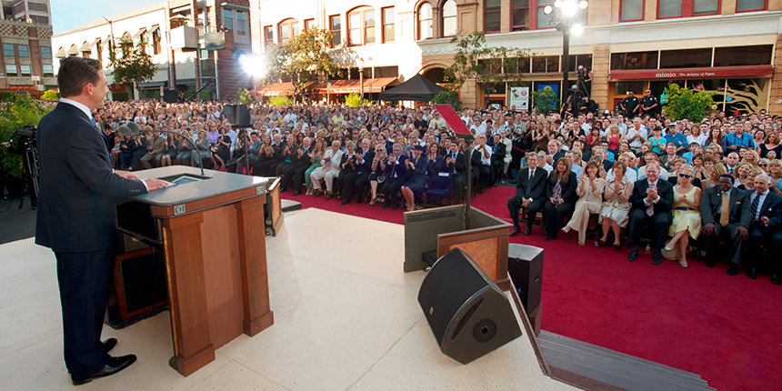 David Miscavige understregede betydningen af denne nye kirke både for Pasadena og for lokalsamfundet i hele San Gabriel Valley og sagde: ”I er nu en del af en bevægelse som savner modstykke i vor historie, og den vokser i styrke hver eneste dag. Oprigtigt talt er vi nemlig dybt engagerede i at hjælpe hele menneskeheden. I denne henseende – og uanset hvor altomfattende og global Scientology religionen er i dag – så glem aldrig, at menneskeheden består af individer. De er hver især unikke på deres egen måde, og de har hver især en historie, som vil gøre dig ked af det, hvis du ikke gør noget ved det. Så tag denne Ideelle Organisation, og få det bedste ud af det. Der er nemlig virkelig en masse hjælp, som vi nu må yde. Og det er det løfte, vi giver i dag til byen Pasadena.”