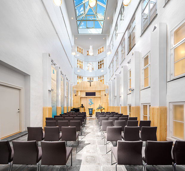 Kirken restaurerede og fornyede dens nye hjem i det centrale København. Den nyklassiske bygning fra 1796, der er på 3.700 m², blev bygget i kølvandet på Københavns brand i 1795, hvor hele området omkring Nytorv og Gammeltorv var blevet opslugt af flammerne. Faktisk forlangte byplanlægningen, at de nye bygninger fik de karakteristiske ”brudte hjørner”, så brandvæsnets vogne med lange stiger kunne komme igennem byens smalle gader.
