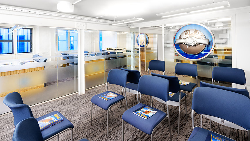 Kirkesalen har til huse i et fire etager højt atrium, og sollys fra glastaget giver hele gården en stilfuld glød. Den vil være vært for samfundsrelaterede arrangementer, hvor folk fra alle trosretninger er velkomne. Bygningen rummer desuden adskillige seminar- og kursuslokaler samt en hel etage, der er afsat til auditering, den åndelige vejledning i Scientology religionen.