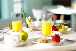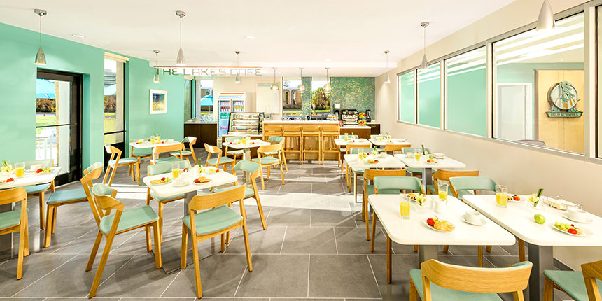 Den elegante Lakes Café – med både indendørs og udendørs siddepladser – tilbyder et mødested for dem, der deltager i events, såvel som for menighedsmedlemmer under pauser i deres Scientology servicer.