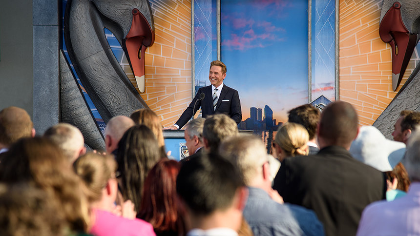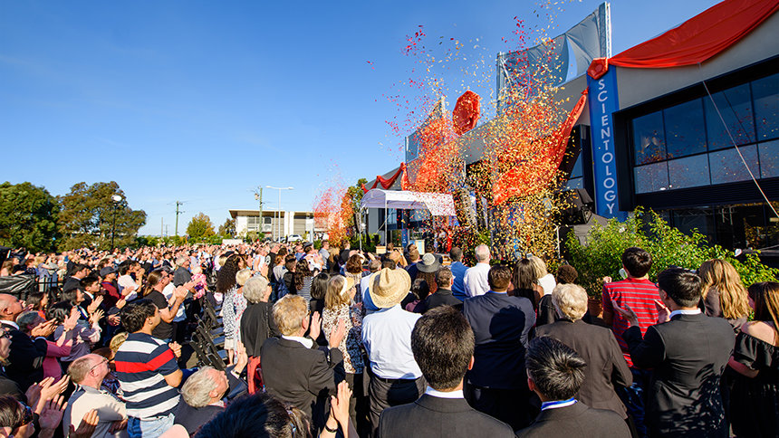 David Miscavige, den kirkelige leder af Scientology, rejste 14.500 km for at nå Perth. Han fortalte festdeltagerene ved indvielsen, at han snart ville gå i lag med en snorklipnings-turne langs yderligere 32.000 kilometer. Men for Perth bekendtgjorde David Miscavige: ”Dette er det NU, som I har ventet på.”