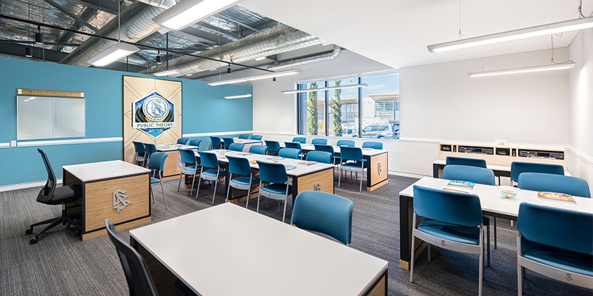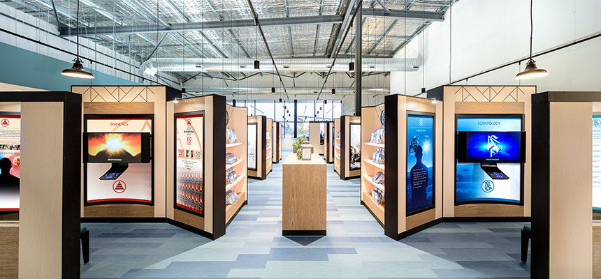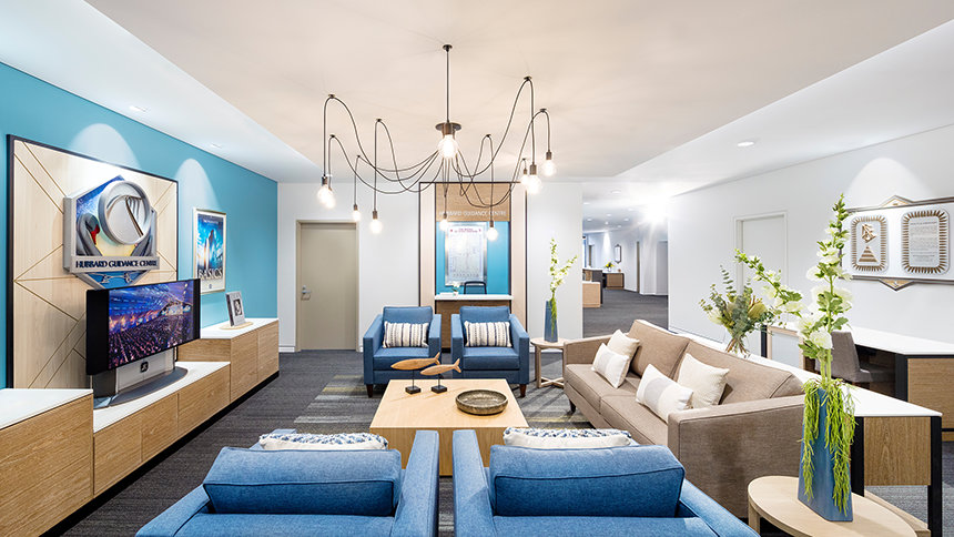 Alle der nærmer sig vores nye Scientology Kirke i Perth er budt velkommen af dens fantastisk facade. Idet medlemmer træder ind i det store rum, bydes de velkommen i receptionen til Informationscenteret. Rummet er åbent med højt til loftet og belysning i en industriel stil. Rene linjer og formørkede metalaccenter med varmt rustik træ giver en moderne industrifølelse ud igennem hele rummet.