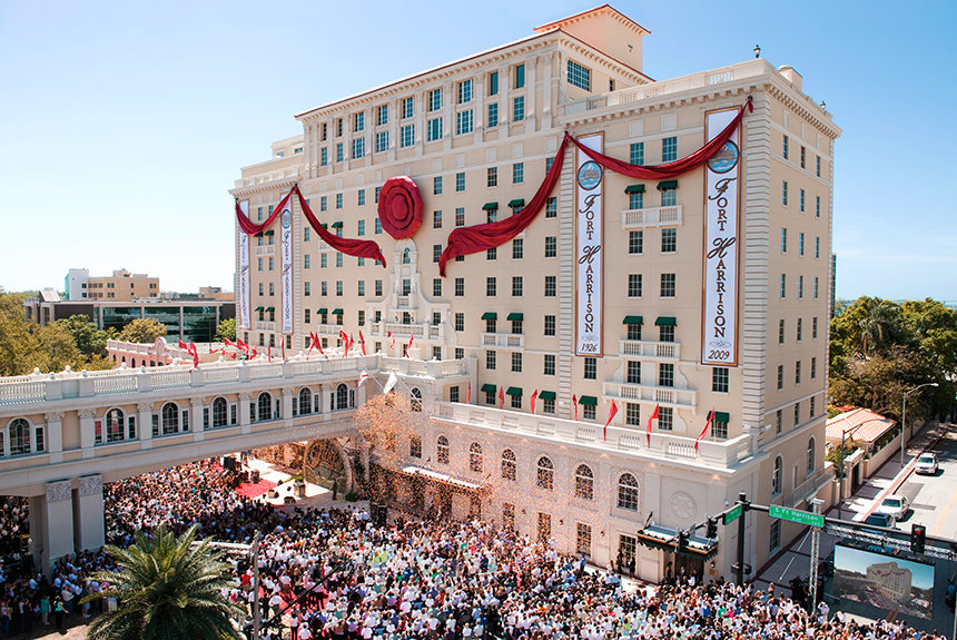 Mere end 6.000 scientologer fra over 50 nationer fyldte gader og fortove i Fort Harrison Avenue den 14. marts 2009, da Bestyrelsesformanden for Religious Technology Center, David Miscavige, klippede båndet for Fort Harrison – det nyligt istandsatte vartegn i Clearwater, Florida.