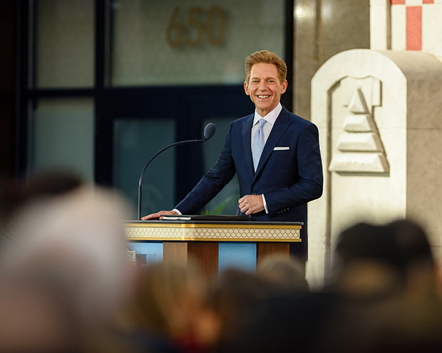 Bestyrelsesformanden for Religious Technology Center, hr. David Miscavige, bød velkommen til den begejstrede menneskemængde, før båndet faldt. ”I dag er denne Anden by virkelig uovertruffen,” sagde hr. Miscavige. ”Før båndet i Windy City falder ned, som i en kaskade, er dette også tidspunktet til at erkende, hvad I allerede ved: Hvordan præcis som Chicago engang blev genfødt, så i dag er der plads til en ny begyndelse. Og således er der plads til at give enkeltpersoner evnen til at leve et bedre liv tilbage – efter deres egen vurdering, sammen med deres medmennesker og til at spille et bedre spil.”