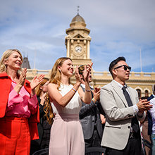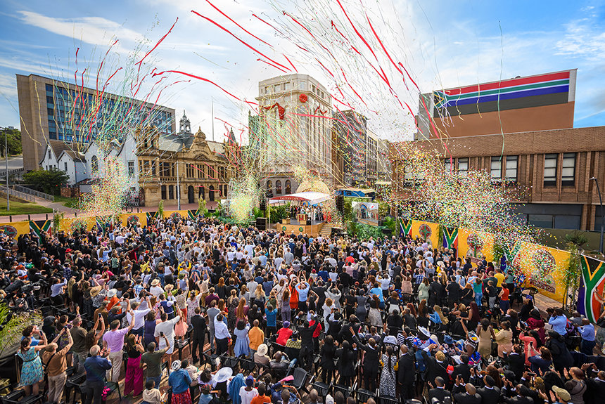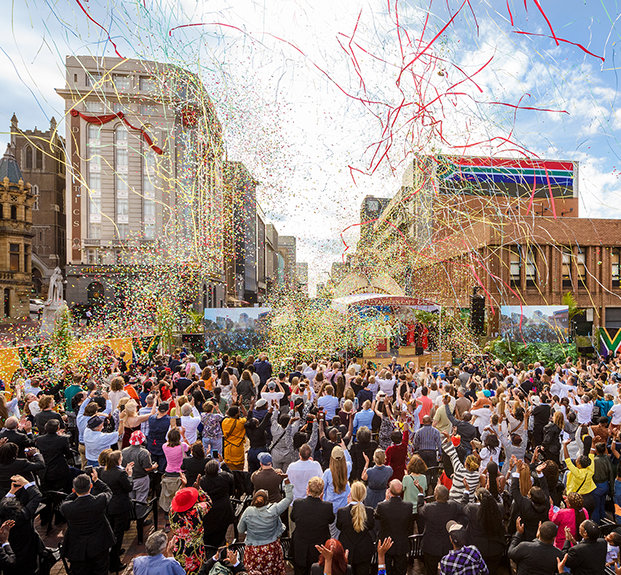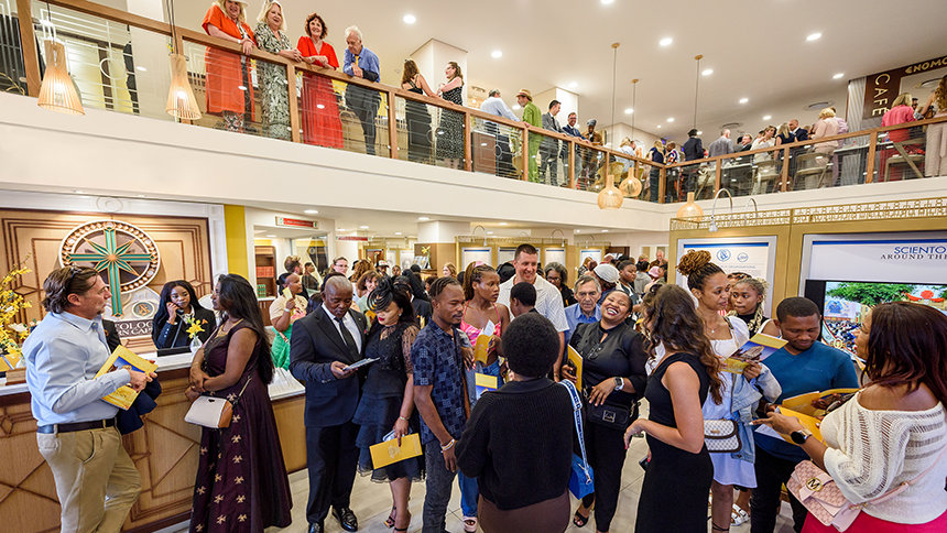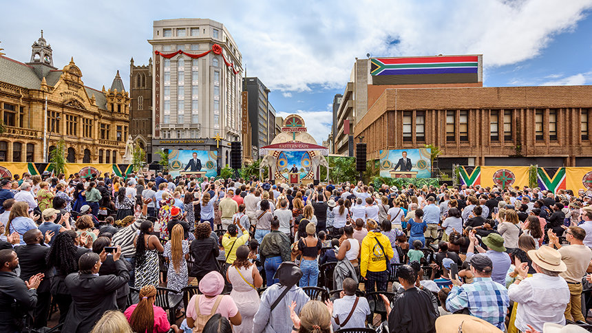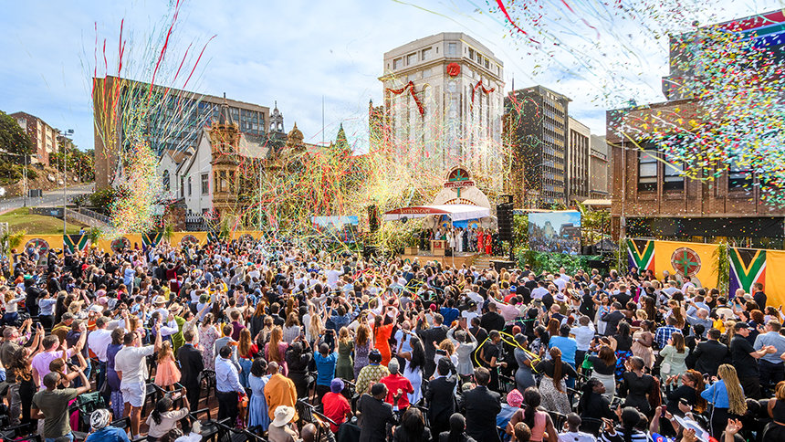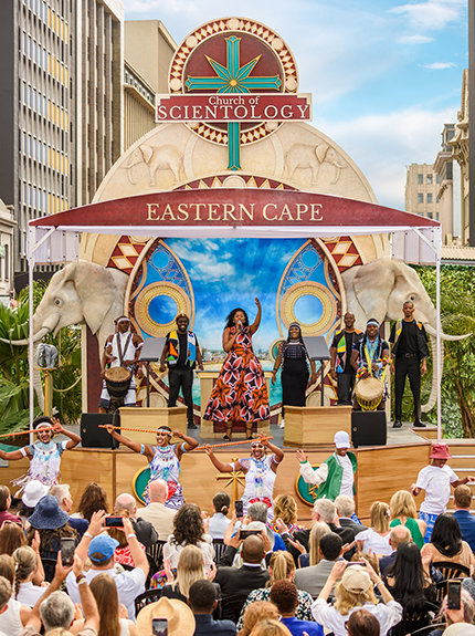 Overalt i den cirkel der udgør den historiske markedsplads, sprudlede energien da samfundsledere, lokale beboere og Scientologister strømmede til for at fejre den Store Åbningsceremoni for den nye Ideelle Scientology Kirke i Eastern Cape. På en solrig, frisk søndag eftermiddag på Solskinskysten startede begivenheden med levende musik og fængslende dans drevet af det rytmiske slag fra traditionelle djembetrommer som indgød deltagerne Afrikas ukuelige ånd og pulserende hjerteslag. Jublen gav genlyd i hele Nelson Mandela Bay som er opkaldt efter den præsident der forenede og forvandlede en nation – og som blev født i Eastern Cape.