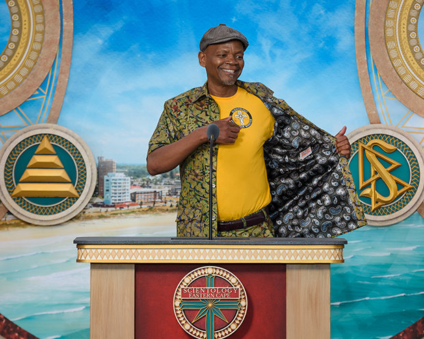 Prins Sonwabile Ndamase fyldte luften med begejstring da han talte om den hjælpende ånd der er legemliggjort i Kirkens Scientology Frivillige Hjælpere. “Min egen historie med jer begyndte med ‘glimt af gult’. Midt under pandemien kom jeres Frivillige Hjælpere hjem til mig og beskyttede min familie. I tog til vores landsbyer, vores townships, byer – overalt.”