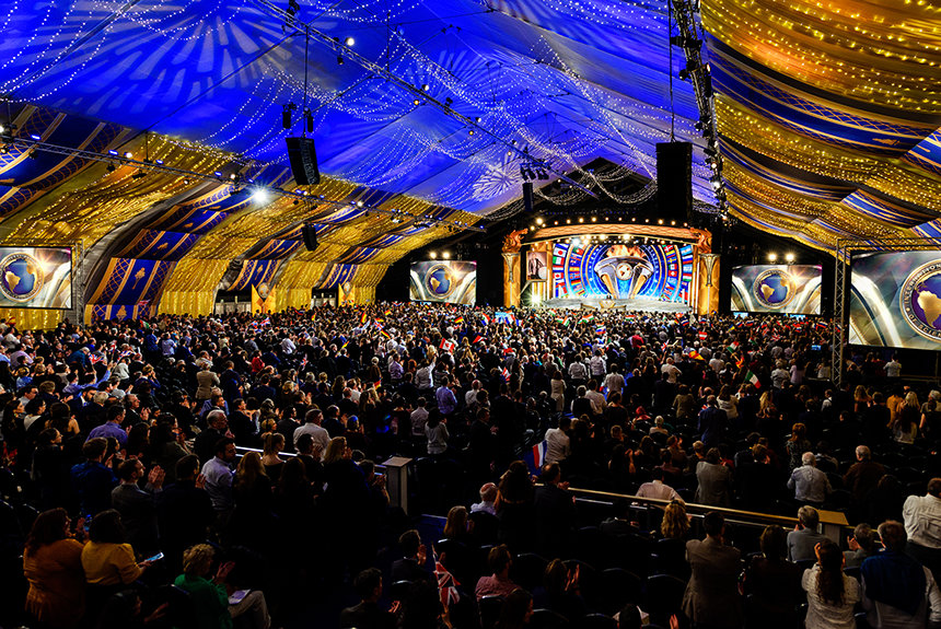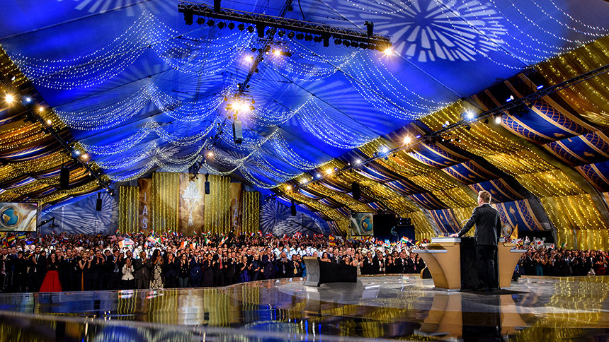 ”Som det er tradition, er det i aften at vi rejser gennem 38.600 km af vores IAS-land og derigennem følger hver vektor for global redning, ” begyndte David Miscavige, den kirkelige leder af Scientology religionen. ”Vores bud på at frigøre verden fra stofmisbrug, vores menneskerettighedsmandat og det samme igen for moral som udbredes gennem de 21 leveregler fra Vejen til lykke. Pointen er: Tror du ærligt talt at historie altid skal rime med elendighed? Og at konflikt og uretfærdighed er uundgåelige? Tja, det mente L. Ron Hubbard aldrig, og det gør IAS heller ikke.”