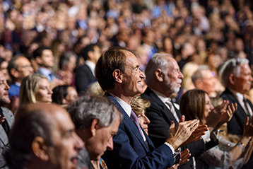 Mr. David Miscavige, den kirkelige leder af Scientology religionen, satte denne aften af ubegrænset fejring i perspektiv, og modtog den første af utallige stående ovationer der rystede auditoriet. Derefter førte han de tusindvis af tilstedeværende på en to en halv times odyssé der ikke kun skildrede LRH’s vej gennem forskning og opdagelser – men som også viste hans uforgængelige indflydelse.