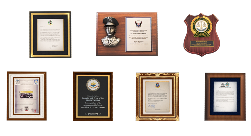Til dato har Freewinds’ endeløse velgørende indsats skaffet mere end 450 priser, anerkendelser og dybtfølte proklamationer fra alle hendes caribiske venner, inklusive hver af øerne og havnen hun rejser til: Antigua, Dominica, St. Martin, St. Kitts, Tortola, Virgin Gorda, St. Vincent, Barbados, Grenada, Aruba, Bonaire, Curaçao, Freeport og Nassau.